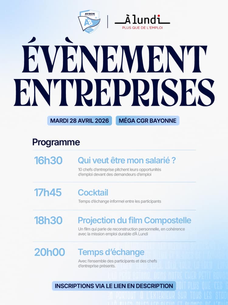 2 Avril 2026Dans le cadre de leur engagement en faveur de l’emploi durable et de l’inclusion, À lundi et l’Aviron Bayonnais Rugby Pro, entreprise à mission, organisent un événement original le mardi 28 avril 2026 au Méga CGR de Bayonne.