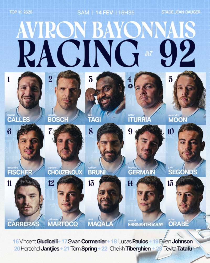 La composition d’équipe pour la réception du Racing 92 au Stade Jean-Dauger, avec un coup d’envoi à 16h35.