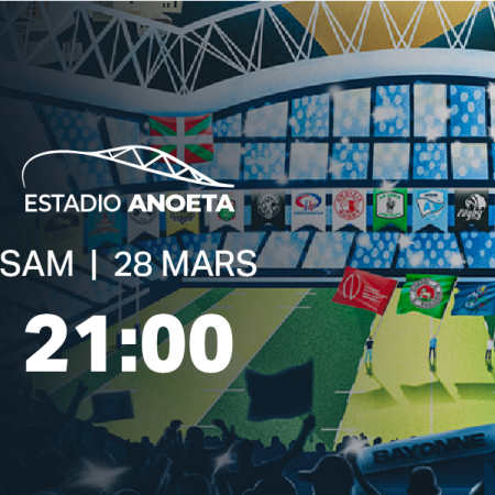 Le 𝘀𝗮𝗺𝗲𝗱𝗶 𝟮𝟴 𝗺𝗮𝗿𝘀 𝟮𝟬𝟮𝟲 𝗮̀ 𝟮𝟭𝗵𝟬𝟬, le stade Anoeta recevra la 20e journée de Top 14 entre l'Aviron Bayonnais et le Stade Rochelais.