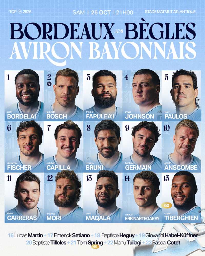 La composition d’équipe pour ce déplacement à Bordeaux, avec un coup d’envoi à 21h00, tous derrière nos 𝗖𝗶𝗲𝗹 & 𝗕𝗹𝗮𝗻𝗰 💪
